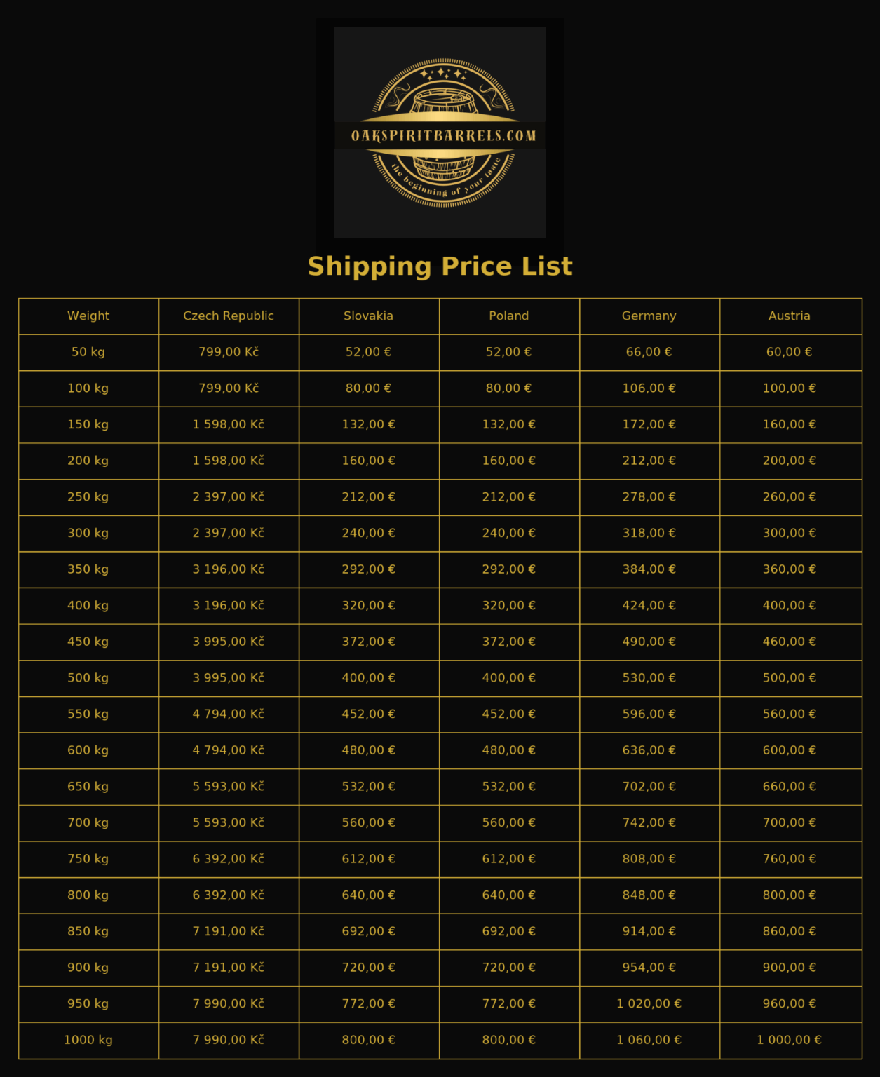 You can find our shipping price list for Austria, Germany, Poland and Slovakia below.